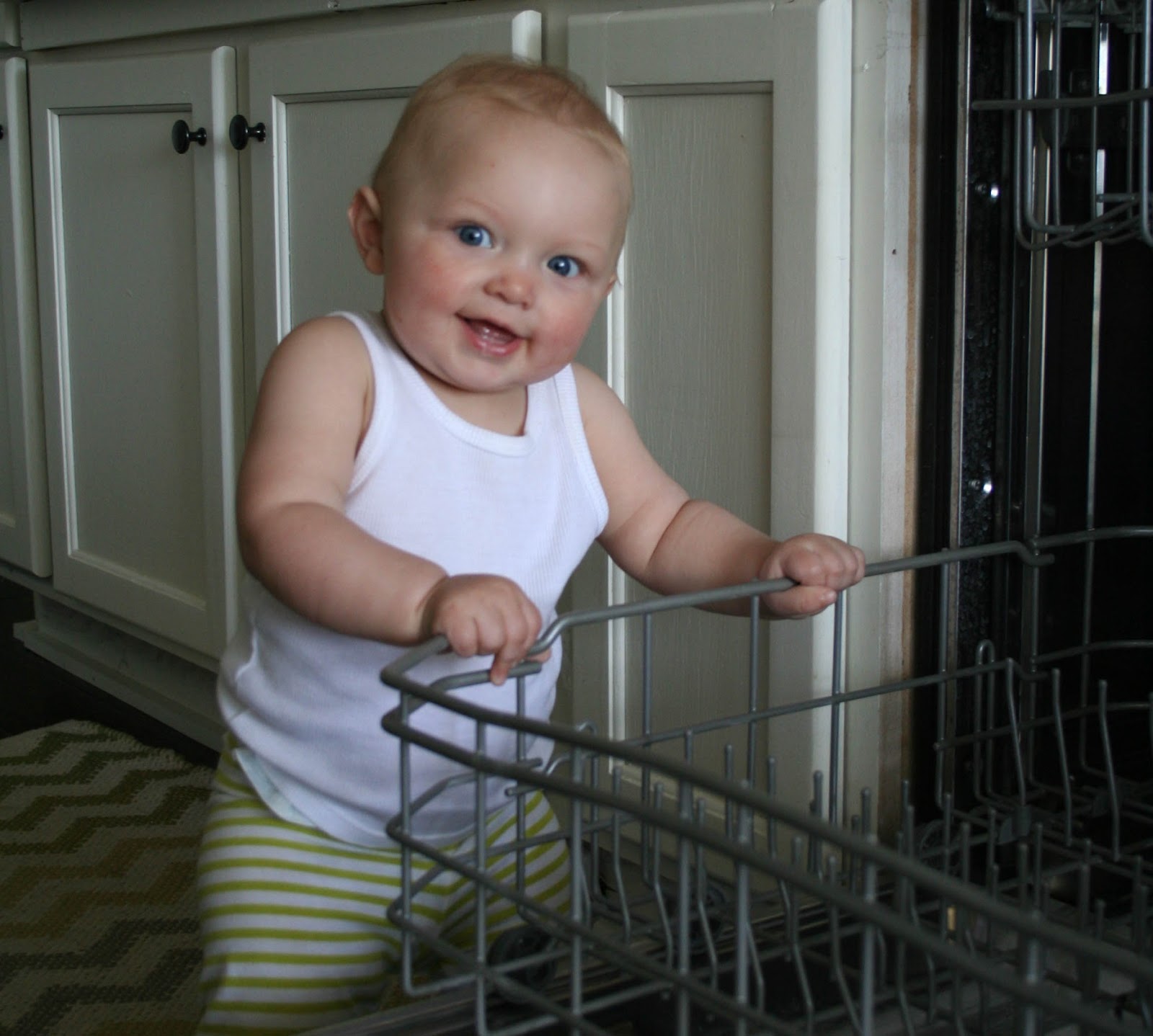 3 - There is nothing cuter than a baby in short shorts. Nothing. Look at those rolls! Note to self...I think it's time to clean the carpet, as that rug is supposed to be a light tan, ha!
